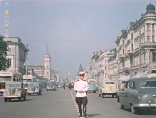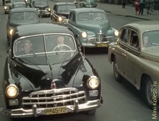 Помогает перевести бабушку через дорогу - на переднем плане Москвич-400. Не путаем с КИМ 10-50. У Москвича воздухозаборники выше (почти под кромкой капота) и длиннее, что и видно на фото. ГАЗ-69 в зеленом окрасе с фарой-прожектором. В ту пору - совсем новый джип. Ведь ГАЗ-69 выпускался на Горьсковском автозаводе с 1953 года - т.е. выпуск начат всего за 4 года до съемок этого фильма. Правда, с 1956 года производство ГАЗ-69 было перенесено на Ульяновский автозавод. С более правильным, желтым номером - масштабная модель в коробочной версии от IST. ГАЗ М20 "Победа". Судя по крыше - кабриолет. Через год ее прекратят выпускать (1946-1958). Победа - первый советский легковой автомобиль с несущим кузовом и один из первых в мире крупносерийно выпускавшихся с кузовом полностью понтонного типа — без выступающих крыльев и их рудиментов, подножек и фар. Всего было выпущено 236 тысяч машин, включая 14 тысяч кабриолетов . На заднем плане Москвич 400-422, фургончик с деревянным кузовом. Чтобы сэкономить стальной прокат, московские конструкторы решили использовать дерево. В народе автомобиль назвали "Буратино". В нормальном состоянии ни один до наших дней не дожил. На выставках можно встретить восстановленные с нуля экземпляры. Еще одна Победа. Точно такого цвета у нас нет, но есть бело-синяя. Старая знакомая - Победа. Обратите внимание на светофон - зеленый сигнал сверху. Этот Москвич мы тоже уже видели. Регулировщик следит за движением из специальной будки. ГАЗ 12 ЗИМ. Роскошный автомобиль, и по тем временам - недосягаемый для простых смертных. Он только что начал поступать с Горьковского автозавода (выпускался с 1956 года). Шестиместный, шестиоконный красавец - модель представительского класса. В первые годы считался престижнее, чем ЗИС.