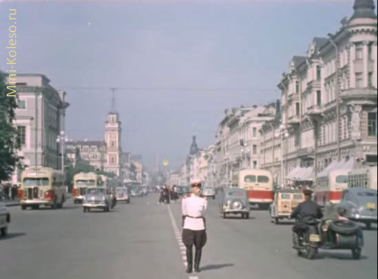 Хорошо видны желтые номера. Читайте о них в конце этого материала. Светофор образца 50-ых годов крупным планом. Штурм будки регулировщика. Хозяин отлучился оштрафовать водителя Москвича. Тот самый Москвич-402, водитель которого что-то нарушил. 402-ой выпускался с 56 по 58 год. Владелец - вероятно, частное лицо. Личный автомобиль, совсем новенький - полный шик. Обратите внимание на веселую расцветочку обивки салона. Переключение режимов светофора регулировщик осуществлял с помощью вот такой поворотной ручки. Сидел регулировщик на винтовой табуреточке. Старые фильмы - единственная возможность сейчас узнать эти детали. Нарушение в работе светофора вызвали крупную пробку. Как бы сказали сейчас - перекресток "завязался". Каждая вторая машина - такси. Про автомобильные номера. Продолжение следует.>>> |