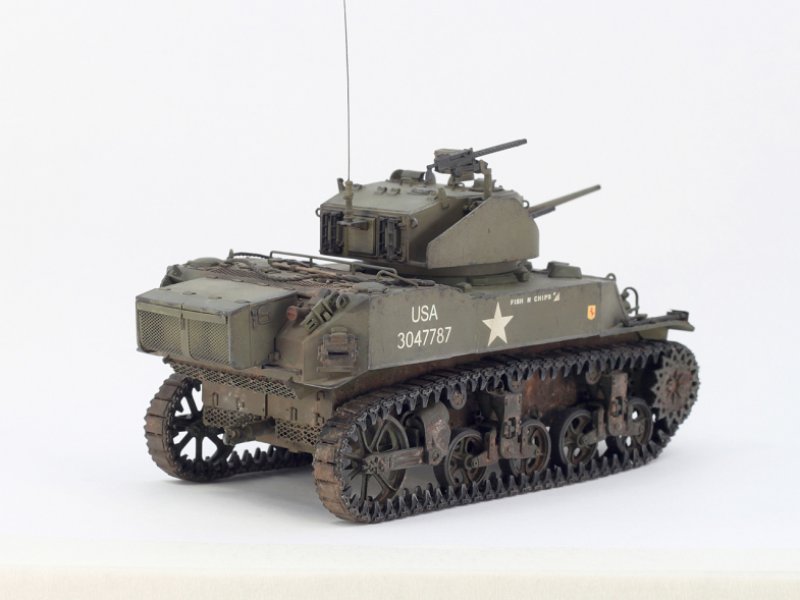 Модель представляет одну из поздних модификаций, M5A1. Машина принадлежала113 Кавалерийскому полку 3 моторизованной дивизии армии США. Место действия- Бельгия, осень 1944 г. Изготовлена из пластика (AFV Club), при доработкеиспользовались наборные гусеницы AFV Club, фары Эльф и самодельнаямелочевка, окрашена акрилом Tamiya, тонирована фильтрами SiN и пигментамиMIG, а также масляными красками и графитом.